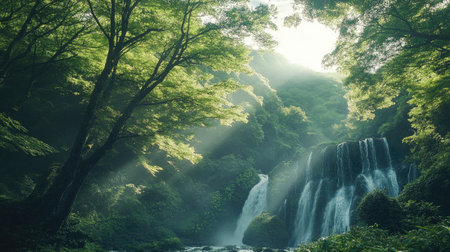 Rays of sunlight filter through the trees in Kikuchi Valley, Japan, illuminating a cascading waterfall and the surrounding green forest in a serene, peaceful setting.
