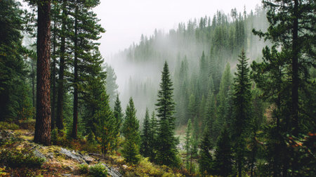 Experience a captivating misty forest landscape featuring towering pine trees enveloped in soft fog. This serene natural scene evokes tranquility and peace.