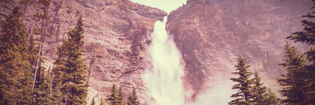 Mountain landscape with waterfall and forest at sunset. Beautiful natural background