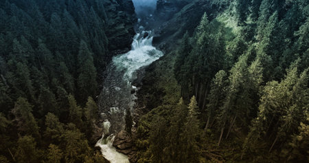 waterfall in the style of atmospheric woodland imagery, misty gothic, aerial view.