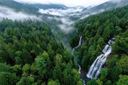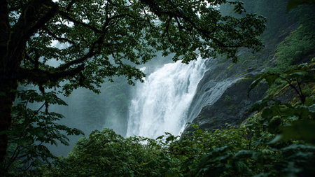 A powerful waterfall plunges through a vibrant green forest, creating a dramatic landscape. The image showcases the natural beauty of trees and flowing water under cloudy conditions. This scene with its soft textures and misty environment could be suitable for environmental or travel-related publications.