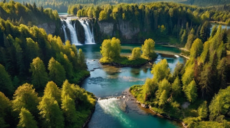 Top view of a North American waterfall cascading into a quiet river, with copy space