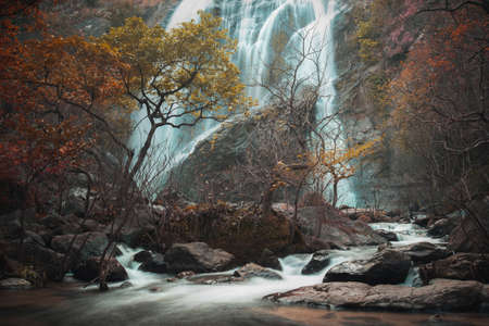 Autumn landscape with waterfall in the forest. Colorful autumn forest.