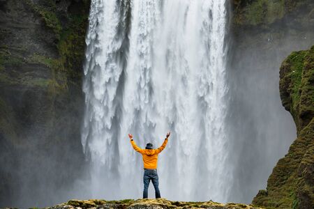 Man admirnig the beauty of iconic Skogafoss waterfall in Iceland