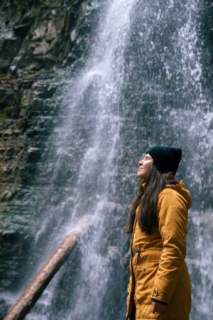 girl in a transparent raincoat stands at the foot of a waterfall in norway against a cliff