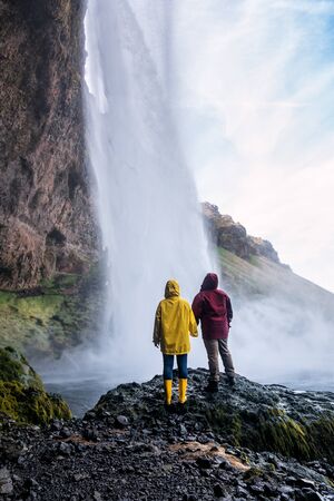 couple in bright clothes looks at an Icelandic waterfall Seljalandsfoss