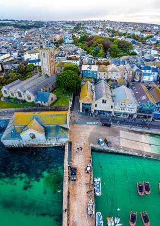 Aerial view of Brixham Harbor on the south coast of Devon in the southwest of England.