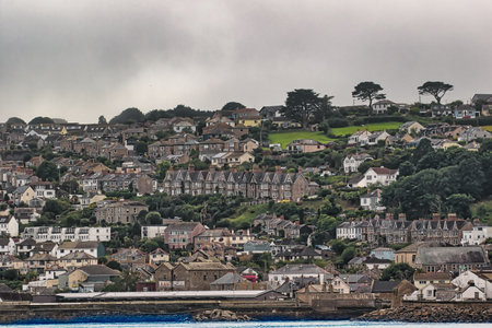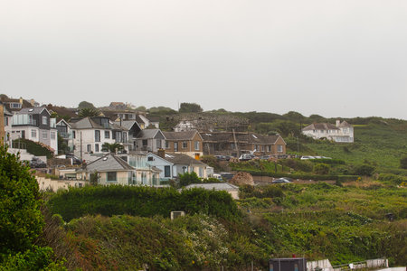 Roofs of buildings covered with sar roof tile, beautiful English architecture, ocean, cloudy day