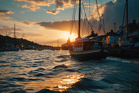 A serene coastal town at sunrise with fishing boats in the harbor, pastel-colored houses along the shore, and gulls flying overhead. The peaceful scene captures maritime charm.