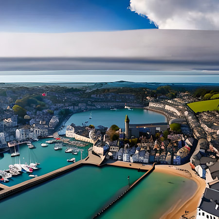 FALMOUTH, CORNWALL, UK - JULY 5, 2023. Aerial landscape panorama view of the National Maritime Museum and harbour in the Cornish seaside town of Falmouth