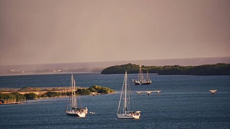 Boats and ships moored in a small port, in the background coastal town, fishing industry and tourism, ships
