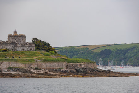 Falmouth, Cornwall, England - July 25, 2018: Pendennis castle was first commissioned by King Henry VIII in response to invasion threats from the continent. Pendennis was built on the mouth of the River Fal, forming a formidable coastal defence with its tw