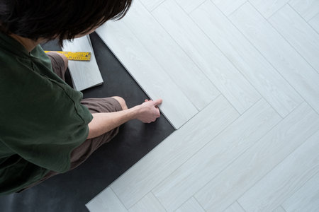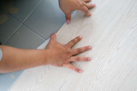 A person installing new vinyl tile floor, a DIY home project.