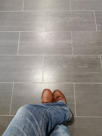 Selfie of sneakers on the floor in a modern shopping center.