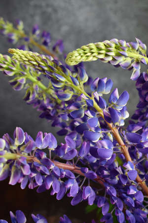 A bouquet of lupines isolated against a gray stone background.