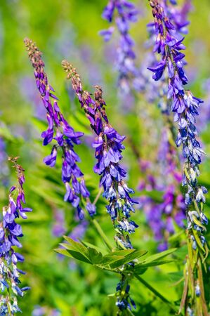 Bright blurred floral purple background. Three twigs with small violet and white Vicia cracca flowers on a blurry dark blue background. Summer backdrop. Nature bokeh template. Artistic image.