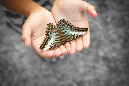 Asian boy holding butterfly.