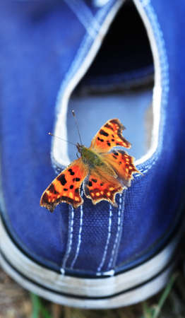summer concept. Nice burretfly sit on blue sneakers