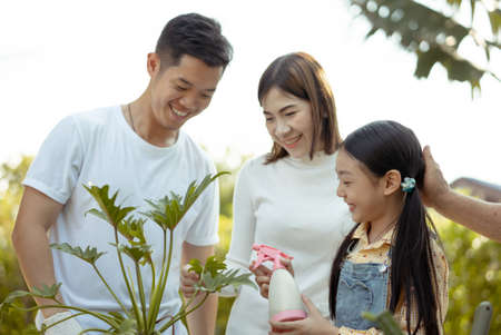 Asian couple with daughter gardening while watching laptop together in the backyard garden. Happy family gardening together and taking care of nature. People and ecology concept.