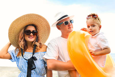 Happy family of three wearing sunglasse and hats at the sand beach holding swimming float ready to swimm. Travel and holiday concept