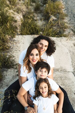 Portrait of the big happy family. Parents with children in countryside outdoors