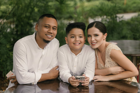 Happy international family. Singaporean father, Eastern European mother, and their mixed-race child smiling. Child holds a mobile phone.
