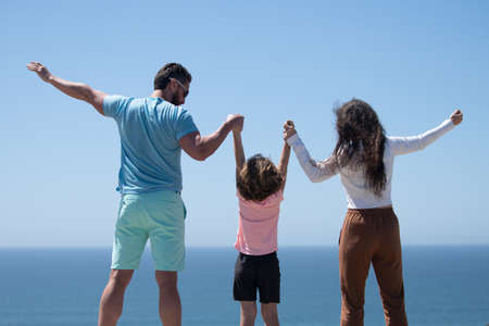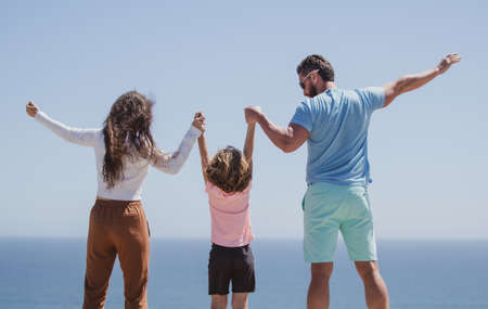 Back view of happy young family walking on beach. Child with parents holding hands. Full length poeple.