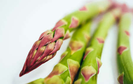 Fresh green asparagus sprout tops, closeup. Two asparagus stems, isolated on white background, macro.