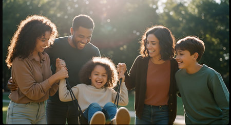 A joyful family with two children and parents at a park. The father holds the young boy on his shoulders while the mother and daughter smile on the swing.