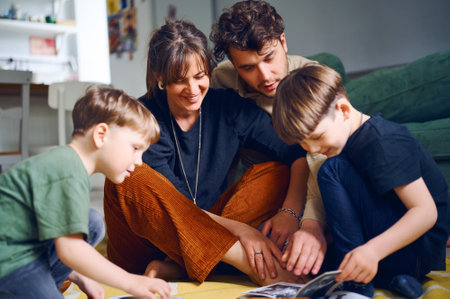 Happy family reading a book together at home, sitting on the floor