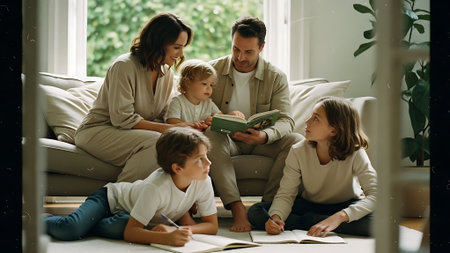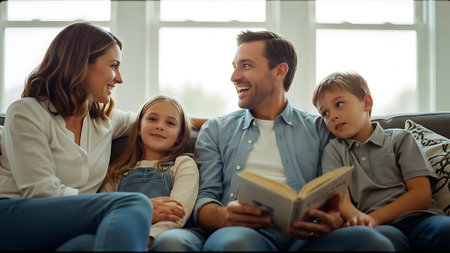 A family of four sits together on a comfortable sofa in a warmly lit room. The composition includes the parents and their two young children. The scene features natural light, soft textures, and a cozy atmosphere. Suitable for illustrating family life, lifestyle, or commercial projects.