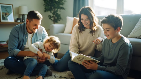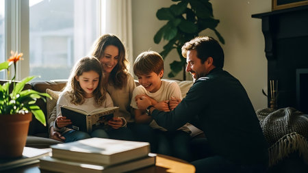Happy family reading a book together at home in the living room.