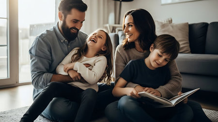 A family of four is captured in a moment of laughter and joy within a domestic setting. The composition showcases warm tones and natural lighting. The image's style is casual and inviting, which would be suitable for diverse commercial or editorial applications, emphasizing family, happiness, and togetherness.