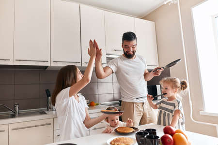 Young happy beautiful family having breakfast together at home. Father, mother and two cute little kids eating healthy food in morning, talking and smiling while sitting in modern kitchen