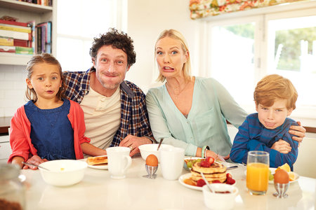 Goofing around at the breakfast table. Portrait of a family having fun while having breakfast together at home.