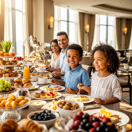 Families gather at a stylish restaurant, savoring a breakfast buffet filled with fresh fruits, pastries, and made-to-order dishes. Happiness fills the air as they share this meal together.