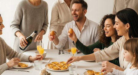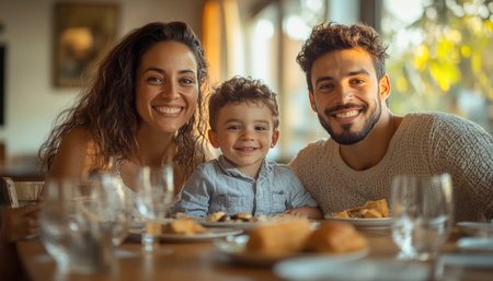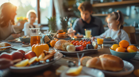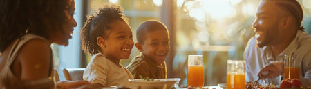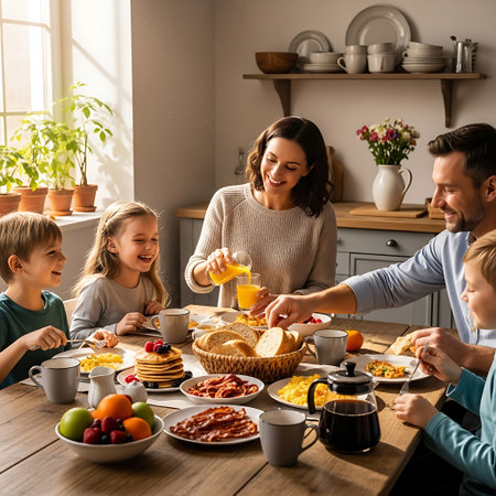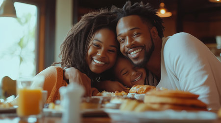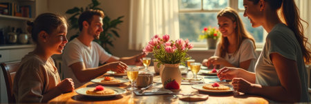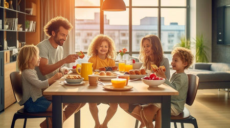 Family enjoying a joyful breakfast together at home with sunlight illuminating the cozy dining area in the morning