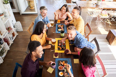 Close Up Of Group Of Friends Joining Family Sitting Around Table At Home Enjoying Meal Together