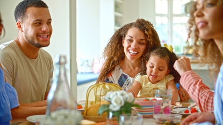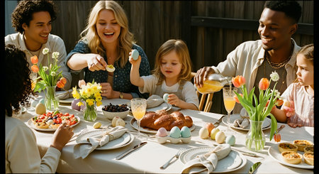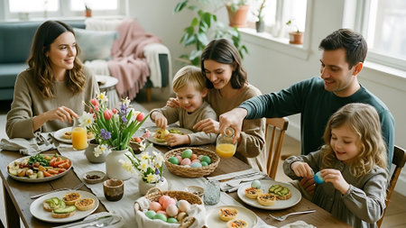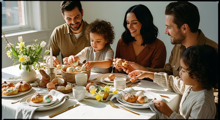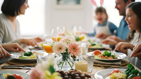 Family Easter meal. Happy family enjoying Easter meal together at home with festive decorations and food.
