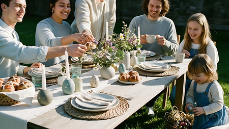 Family having festive dinner together. Table setting with traditional food and spring flowers for Easter celebration