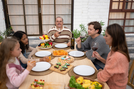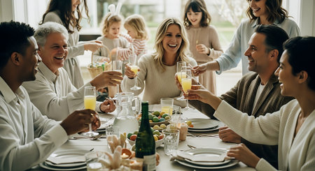 Portrait of happy big family celebrating having fun and lunch together enjoying spending time together at home