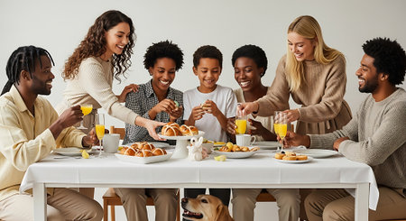 Happy family having breakfast in the kitchen at home. Multiethnic group of people having dinner together.