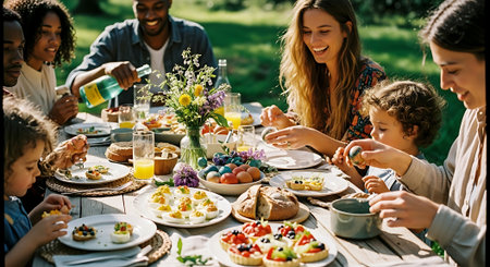 A family gathers around a table filled with delicious pastries and fruits in a sunlit garden during a warm afternoon