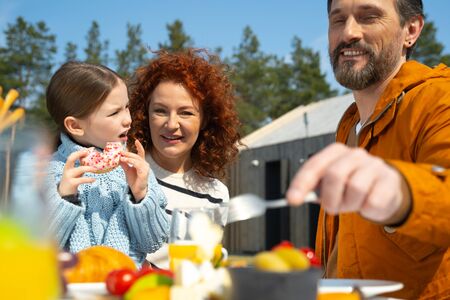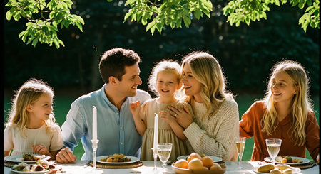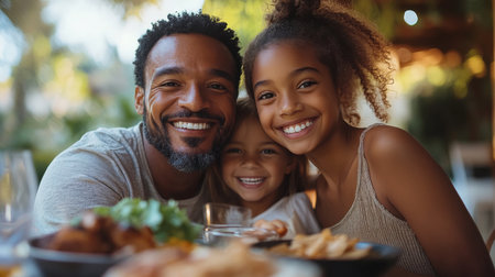 A joyful father enjoying a meal with his two daughters outdoors at a sunny gathering with vibrant greenery. Generative AI