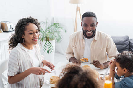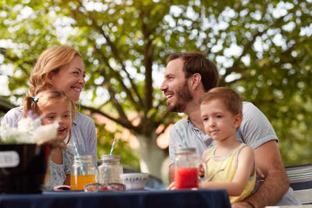 Happy family having breakfast at home. Mother, father and children having a good time together.