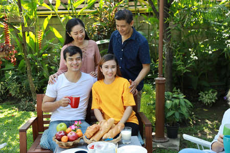 Happy multiethnic family sitting at a breakfast table in backyard outdoor on sunny day with smiling face. Happy caucasian and asian family sitting and having conversation with good time outdoor.