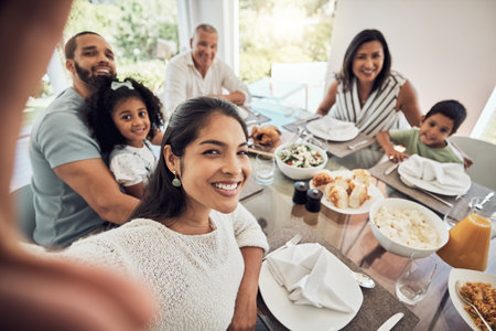Big family selfie while eating food or lunch together in their home dining room table with a portrait smile. Happy Puerto Rico parents, mother and father with children for digital holiday memory