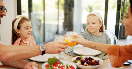 Cheers, family and girls with food, celebration or healthy meal with happiness, comfort or orange juice. Parents, father or mother with daughters, home or support with love, toast or bonding together