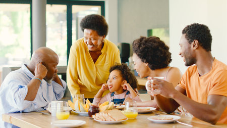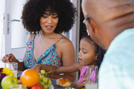 Image of happy multi generation african american family eating breakfast together. Family and spending quality time together concept.