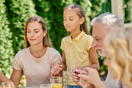 Caucasian three generation family holding hands saying grace before eating meal together in garden. three generation family celebrating independence day eating outdoors together.